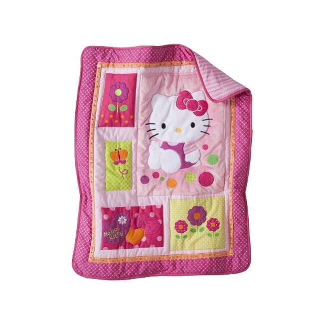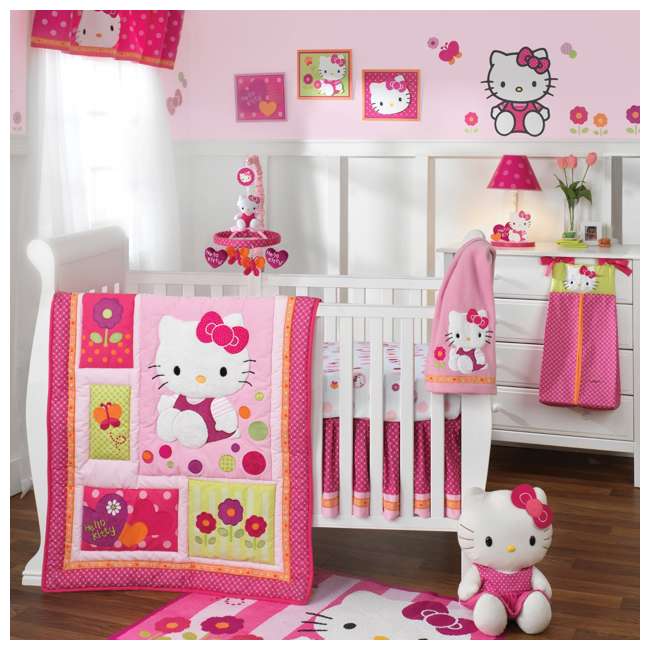 The hello kitty garden 5 piece baby crib bedding set includes: Coordinating dust ruffle and sheet feature an allover hello kitty character print. 100% cotton baby bedding hello kitty themed nursery baby bed set, toddlers crib bedding for baby girls, duvet cover set with comforter, 5 pieces. Bright colors and a joyful theme. The bumper keeps your baby safe from rolling into the sides of the crib and bumping his or her head, and the dust ruffle completes the look of the hello kitty themed crib.